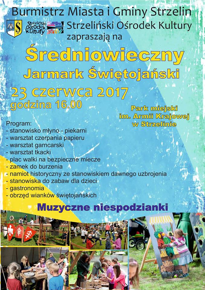 Serdecznie zapraszamy na Jarmark Świętojański, który odbędzie się już w najbliższy piątek (23 czerwca), w Parku Miejskim im. Armii Krajowej w Strzelinie. Początek imprezy - godzina 16.00, a program zamieszczamy na plakacie promującym wydarzenie.